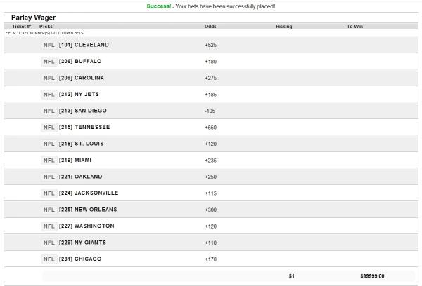 Better strategy would be straight betting a couple small home dogs ml that should have a real chance. Then throwing a few 4 team teasers together with dogs and a total thrown in.