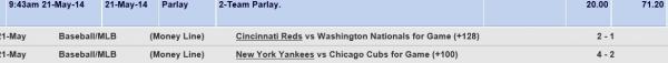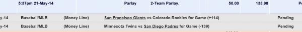 5:35pm 24-May-14 Parlay 2-Team Parlay. 100.00 294.81 Pending