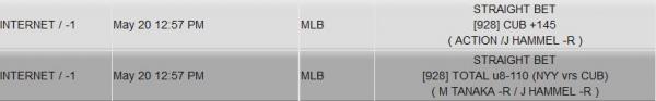 #2Great day with that value underdog pick. Cubs cruised to an easy win. Tanaka was 42-0 and had not lost since 2012 including his Japanese career. i am on the hunt for some good picks tomorrow. Went 2-0 on SBR picks today in Cubs money line and Heat spread. Let's keep it going tomorrow!!Comment -