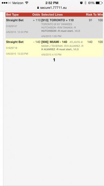 #43I got the Marlins at -140 Gonna take the Mets and Padres...Originally posted by High3rEl3m3ntGT21, was terrible odds. I don't hide, good or bad.