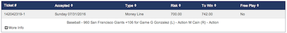 #922Giants ml +106…..$700=$742Comment -