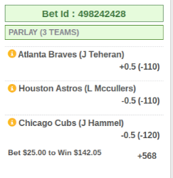 KC +2.5 / Marlins +2.5 / Tigers +2.5 / BoSox +1.5...to be honest I was intent on a parlay with Jays +1.5 and BoSox ML, but the BoSox line move made me a bit worried.
