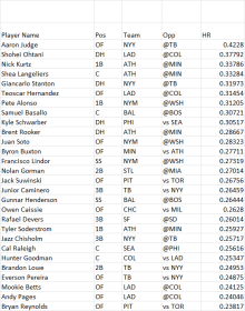"If recent trends tell us anything, it's that Austin Gomber is certain to allow a home run on Dinger Tuesday. Colorado's starter has given up 14 moon shots across his last 10 starts, with opponents hitting homers at a 90% clip over that span. He's in the midst of a horrible stretch that's seen him surrender moon shots in every start since July, and two in all three August outings.