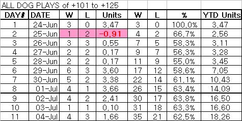 SUNDAY'S Away Dogs of +101 to +125: 3-1 +2.44