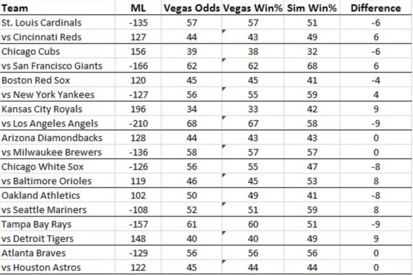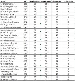 Todays afternoon game, (NYY) is currently a play with 48% Vegas Win% and 59% Sim% given the line from The Greek (-115/+105), but neither Pinnacle nor 5Dimes have it listed currently.