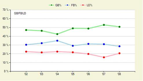 Roy Oswalt has been lit up this season as he has been giving up a lot of long balls which is uncharacteristic of the pitcher we've seen over the last couple years. Oswalt is allowing almost 2 hits per inning despite the fact that over 50% of the batted balls against him are grounders: