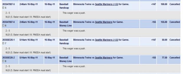 This night was absolutely brilliant with 5 (A) bet + the Toronto (C) bet... But when I check my book (Pinnacle) they said that the double bet (2 on M/L and 2 on R/L) is cancelled beacuse the wager was a push!!!