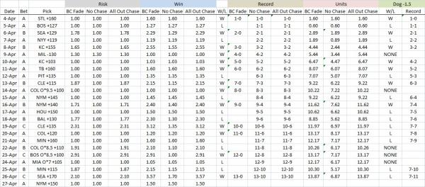 (Bet 1 to win 1.50) *This is a simple overall record, betting to win 1 if negative odds, to risk 1 if positive odds. BC Fade overall record: 13-13, +3.87 units