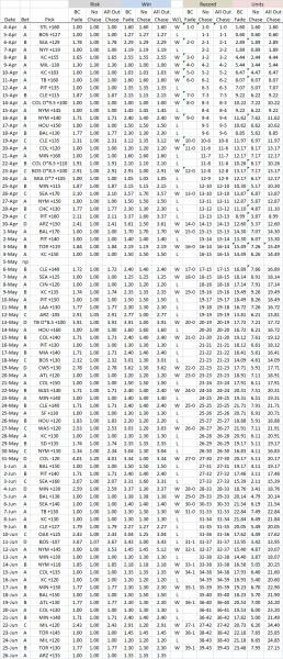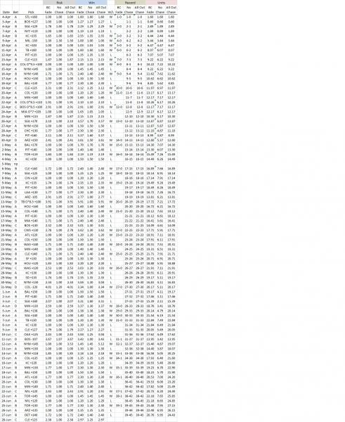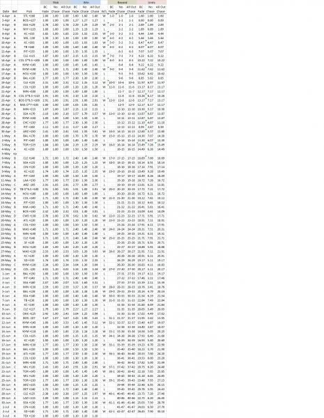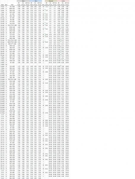Hi fnorbert. Instead of doubling my bet on a loss or something, I bet to win the previous bet AND add 1 additional unit (if -odds) or risk 1 additional unit (if +odds). So by the time I get to a D bet I haven't quadrupled by bet. If you follow along in the spreadsheet you can see that if I lose 1 unit on an A bet I don't bet 2 units on B bet, etc. It just lowers the amount wagered. Cheers!