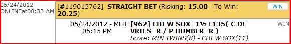 Humber has settled down after the national attention his perfect game created. I think he gets a quality start here and enough offense for the win. The Twinkies are calling up a 6 year minor leaguer who is 1-4 with an over 4 ERA in AAA ball this year. He is only getting the call up due to the fact that Marquis and Liriano are no longer serviceable as MLB starting pitchers. The Twins starting pitching is dreadful and they are forced to serve up their farm boys as sacrificial lambs.