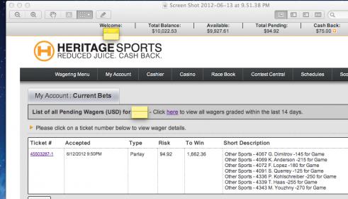 Ticket # Accepted Type Risk To Win Short Description 6/12/2012 9:50PM Parlay 94.92 1,662.36 Other Sports - 4067 G. Dimitrov -145 for Game/Win
