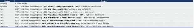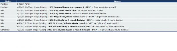 #717---- 4/23/13 8:02pm -$20.00 $80.00 1 Wager(s) Placed 176242420-1 $20.00 $674.80 Loss 6 Team Parlay Win 4/27/13 10:30pm UFC Fighting 1302 Phil Davis -335* vs Vinicius Magalhaes Win 4/27/13 11:59pm Props Fighting 1009 Jones wins inside distance -350* vs Not Jones inside distance Win 4/27/13 11:00pm Props Fighting 1205 Nelson wins inside distance -133* vs Not Nelson inside distance Loss 4/27/13 10:00pm Props Fighting 1409 Miller wins inside distance +239* vs Not Miller inside distance Win 4/27/13 9:30pm Props Fighting 1509 Khabilov wins inside distance -102* vs Not Khabilov inside distance Win 4/27/13 8:30pm Props Fighting 1709 McMann wins inside distance -130* vs Not McMann inside distance Comment -
