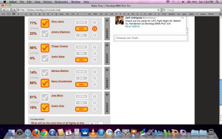 #69Furry Lucy tells me their play is a parlay on Tavares and Thatch. She also predicts a play on Sarafian.Originally posted by Ron_Paul_2012Same here all plays are very small. Oddsbreaker has a play on the Salas vs Tavares match. I am assuming their play is Salas because he is +185. However, I am not sure what they see in Salas in order to make a play on him.