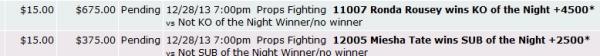 Rousey -630 straight to close 1 parlay.. Rousey by submission -390 to close another.. took Tate light to hedge..