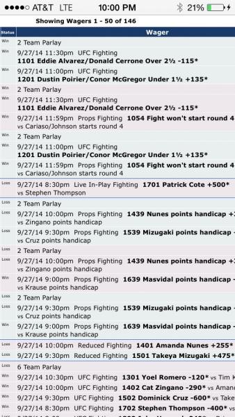 Originally posted by Lick496Fight won't go 3 round distance -135*<small style="padding: 0px; margin: 0px;">vs</small> Collard/Holloway goes 3 round distance .405u to win .3uOriginally posted by Lick496Live bet Francis Carmont -195* -.39u to win .2uwow thats too many plays... lolOriginally posted by Lick496Jordan Mein/Mike Pyle* Under 1½ +135 .2u to win .27u