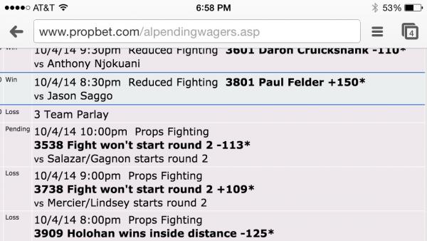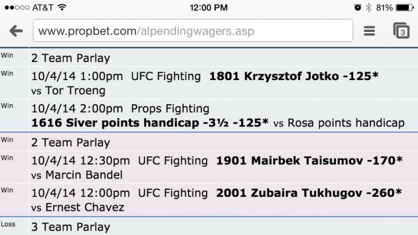 .3u to win .36uWin 2 Team Parlay Win 10/4/14 12:30pm UFC Fighting 1901 Mairbek Taisumov -170* <small style="padding: 0px; margin: 0px;">vs</small> Marcin Bandel Win 10/4/14 12:00pm UFC Fighting 2001 Zubaira Tukhugov -260* <small style="padding: 0px; margin: 0px;">vs</small> Ernest Chavez Comment -