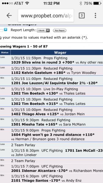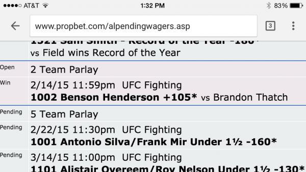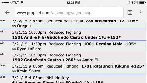 .2u3 Team Parlay Loss 3/14/15 11:30pm UFC Fighting 1101 Carla Esparza -150* <small style="padding: 0px; margin: 0px;">vs</small> Joanna Jedrzejczyk Win 3/14/15 11:00pm UFC Fighting 1202 Johny Hendricks -380* <small style="padding: 0px; margin: 0px;">vs</small> Matt Brown Loss 3/14/15 11:59pm Props Fighting 1060 Pettis points handicap -5½ -265* <small style="padding: 0px; margin: 0px;">vs</small> Anjos points handicap