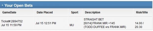 [ # ] PARLAY (8 TEAMS) ( Risking: 10.00 - To Win: 1,328.78 ) LOSE 07/16/2015 @ 12:40 AM MU [24401] FRANK MIR +170 (FRANK MIR vrs TODD DUFFEE) Score: FRANK MIR(0) - TODD DUFFEE(0) PEND 07/16/2015 @ 12:18 AM MU [24406] TOTAL u2.5 +155 (JOSH THOMSON vrs TONY FERGUSON) Score: JOSH THOMSON(0) - TONY FERGUSON(3) LOSE 07/15/2015 @ 11:45 PM MU [24409] TOTAL o2.5 -135 (MARION RENEAU vrs HOLLY HOLM) Score: MARION RENEAU(0) - HOLLY HOLM(3) WIN 07/15/2015 @ 11:10 PM MU [24413] TOTAL o2.5 -195 (SCOTT JORGENSEN vrs MANNY GAMBURYAN) Score: SCOTT JORGENSEN(0) - MANNY GAMBURYAN(3) WIN 07/15/2015 @ 09:45 PM MU [24426] SAM SICILIA -210 (YAOTZIN MEZA vrs SAM SICILIA) Score: YAOTZIN MEZA(0) - SAM SICILIA(3) WIN 07/15/2015 @ 08:38 PM MU [24434] RANI YAHYA -105 (MASANORI KANEHARA vrs RANI YAHYA) Score: MASANORI KANEHARA(0) - RANI YAHYA(3) WIN 07/15/2015 @ 07:35 PM MU [24441] TOTAL o2.5 -115 (ILDEMAR ALCANTARA vrs KEVIN CASEY) Score: ILDEMAR ALCANTARA(0) - KEVIN CASEY(3) WIN 07/15/2015 @ 07:08 PM MU [24446] LYMAN GOOD -270 (ANDREW CRAIG vrs LYMAN GOOD) Score: ANDREW CRAIG(0) - LYMAN GOOD(2) WIN $-10.00 $1,200.00 Comment -