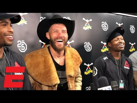 Donald “Cowboy” Cerrone speaks after his thrilling first-round submission victory vs. Mike Perry at UFC Fight Night: Denver to commemorate the 25th anniversary of the promotion. Cerrone discusses how his mindset changed fighting for the first time as a father and bringing his four-month old son, Dacson Danger Cerrone, into the Octagon after winning. Cowboy says the UFC has already brought a name to him as a potential new opponent at 155 pounds, while saying he wishes to fight at UFC 232 at the end of December. Cerrone brings his new coaches into the scrum and says he has nothing to discuss regarding former trainer Mike Winkeljohn, who cornered Perry.
