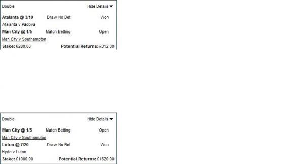 | 1281***84-1 | 7/15/12 1:01pm | $250.00 | $267.77 | Pending | 3 Team Parlay | |