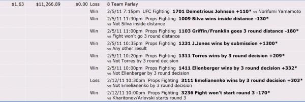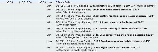 For posterity I'm going to post the !@$ %#@%!@$^@#$%!@$#@!%!!!!ing parlays that were lost when Fedor lost in this thread as well. I did hedge, but I'm really kicking myself for not recognizing the value on Bigfoot earlier. I was feeling so nervous the days leading up to this fight, and then at the start of the second round I knew it was over and I could kiss my parlay goodbye (until the end of the second round, but then it really was over).