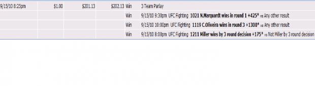 #110Ugh. Yeah, Florian rained on my birthday. I had more parlays than I listed here, and most of them busted because of him. He just didn't look quite like himself. He was very tentative, more so than we're used to seeing. In the final 20 seconds or so he knew he was about to lose a decision, was on his feet, and didn't even throw a single punch or kick. But I definitely underestimated the effectiveness of Maynard's wrestling, and should have at least hedged with a small Maynard by decision bet. Hindsight is always 20/20.