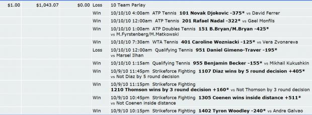 #225To explain why I'm so pissed... 9 out of 10 on a parlay at 1043 to 1 oddsOriginally posted by laskerStrikeforce Result: +6.85u I only wish I would have had the guts to bet Coenen inside the distance straight up (@+511), which was my instinct. I did have it in a number of longshot parlays, but devastatingly one tennis upset screwed them all up.