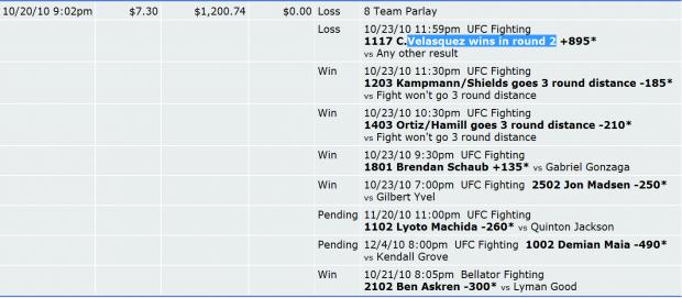 I wish I could say it went exactly like this for me in real life, but unfortunately I bet too many parlays and they were all busted in the main event. After Schaub won so comfortably I was quite sure one of my longshot parlays was going to come through. Any other result in the main event besides a decision or Cain winning in round 1 would have made profit, most results being good chances big profit (that is, for poor little ol' me). Hope the rest of you had a winning night.