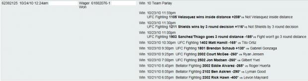 You must have won at least 1 8 team parlay before for an UFC/Strikeforce event before you can private message me .. if the parlay does hit .. I will give you 25 % of the profits ..