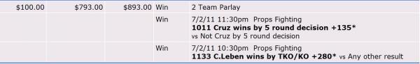 The number of parlays I play depends on the event. for this event that was the most expensive parlay I played but I had fourteen serious parlays in total, most of them between $10 and $50 aside from a $100 two-team parlay of Leben by TKO and Cruz by decision which saved my night and kept me in the green. I also had a few $1-$5 longshot parlays. I play too many parlays but starting now I'm getting more serious about BR management.