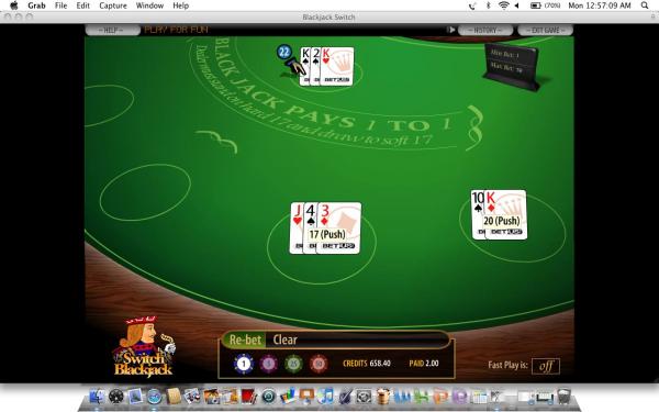 #6Blackjack Switch is a variant of blackjack in which a player is dealt two hands and is allowed to swap the top two cards between hands. For example, if the player is dealt 10-5 and 6-10, then the player can swap the top two cards of each hand to make hands of 10-10 and 6-5. Natural blackjacks are paid 1:1 instead of the standard 3:2, and a dealer 22 is a push.