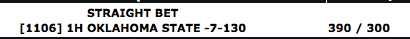 #11Surprised 2nd half bet was only -7 again considering OkSt gets the ball first. I like it.Comment -