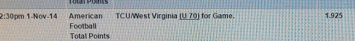 #91wk10 Oct-30 Ga Southern -21 W -24 3 14W-6L-1 50 Oct-31 Memphis -21 L -24 3 -50 Nov-01 Maryland +3.5 W 3 0.5 50 Nov-01 Maryland under 48 W 44.5 3.5 50 Nov-01 Texas A&M -29.5 L -32 2.5 -50 Nov-01 BC over 40.5 W 40 -0.5 25 Nov-01 Central Michigan -14 W -13 -1 25 Nov-01 USF +3 2H L 0 0 -25 Nov-01 Western Michigan -5.5 W -6.5 1 50 Nov-01 La Tech under 69 P 68 1 0 Nov-01 NC ST +5 W 2.5 2.5 50 Nov-01 Virginia +4 L 4 0 -25 Nov-01 West Virginia +4 W 3.5 0.5 25 Nov-01 West Virginia under 70 W 69 1 50 Nov-01 Arkansas St -14.5 W -15 0.5 50 Nov-01 La Laf -5.5 W -7 1.5 100 Nov-01 UNLV pk L -1 1 -25 Nov-01 UTEP -7 W -8.5 1.5 50 Nov-01 California +4.5 W 3.5 1 50 Nov-01 Nevada -5.5 W -2 -3.5 25 Nov-01 Nevada over 50 L 48.5 -1.5 -50 54% 104 64-54-3 950.00 Comment -