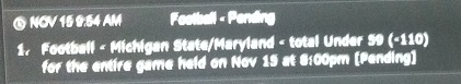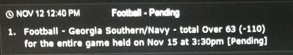 #156wk12 Nov-12 Umass pk W -3 3 14W-10L 50 Nov-14 Tulsa under 56.5 W 55 1.5 25 Nov-15 Temple +10.5 L 11 -0.5 -50 Nov-15 C Mich -13.5 L -18 4.5 -50 Nov-15 C Mich over 48 W 54 6 25 Nov-15 Nevada +2 L 3 -1 -50 Nov-15 Marshall over 64.5 L 66 1.5 -25 Nov-15 NC St -12 W -14.5 2.5 25 Nov-15 App St +14.5 W -15 -0.5 25 Nov-15 App St over 64.5 W 62 -2.5 25 Nov-15 Navy over 63 W 60 -3 50 Nov-15 ND over 50 W 53.5 3.5 50 Nov-15 Washington +9 W 7.5 1.5 25 Nov-15 Washington under 59.5 W 59 0.5 25 Nov-15 Alabama over 52 L 55.5 3.5 -25 Nov-15 Kentucky +7.5 L 11.5 -4 -25 Nov-15 South Alabama under 51 W 51 0 50 Nov-15 Hawaii under 55 W 53.5 1.5 -100 Nov-15 Idaho -3.5 L -5.5 2 25 Nov-15 Mich St under 59 W 58 1 50 Nov-15 Boise St -14 L -14 0 -50 Nov-15 Az St under 61.5 L 63.5 -2 -25 Nov-15 Utep -6 W -6.5 0.5 25 Nov-15 Miami-fl +2.5 L 1.5 1 -25 50 0.53% 161.5 89-80-3 750 Comment -