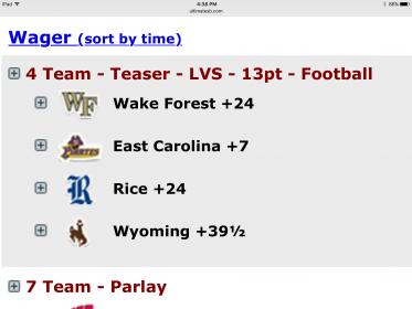 | 10/29/15 2:02pm | $425.00 | $411.58 | Pending | 3 Team Parlay | |