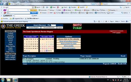 Dec 29 2:05pmFootball - Pending11000.00 to win 10000.00 1. Football - Maryland - spread -8 (-110)