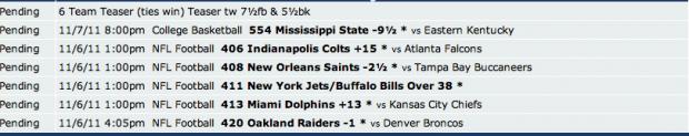 Hey guys sorry about the inactivity for today. Never had a good chance to cap any of the later games because I was already out tailgating for our game. This will be the last saturday where I will have this few plays. Hopefully I can pick some winners in NFL tomorrow to keep us on track. Good luck.