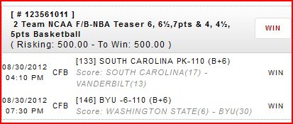 I decided a teaser was the better way to go with the South Carolina game. Picked up South Carolina -3 at half as well. Also, have a $500 profit waiting for me in Vegas. Parlayed South Carolina ML with BYU ML with Lynx beaver ball ML.