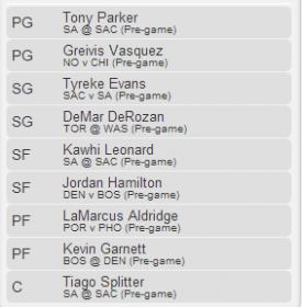 PG Goran Dragic Pho@Por 10:00PM EST $5,300 SG/SF Arron Afflalo Cha@Orl 07:00PM EST $4,700 SG/SF Joe Johnson Mil@Bkn 07:30PM EST $5,600 PF/C Tim Duncan SA@Sac 10:00PM EST $8,300 C Brook Lopez Mil@Bkn 07:30PM EST $7,100 PG Ty Lawson Bos@Den 09:00PM EST $8,100 PF/C LaMarcus Aldridge Pho@Por 10:00PM EST $7,900 PF/C Andrea Bargnani Tor@Was 07:00PM EST $3,000 Comment -