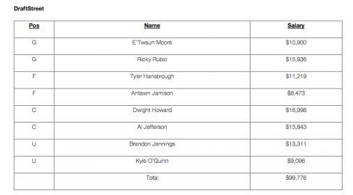 #557More than likely (If I can resist) will be my last lineup should it not cash tonight. Good luck guys.PG Brandon Jennings Mil@Phi $7,400 36.0 SG Paul George Ind@Hou $7,500 38.4 SF Tobias Harris Orl@Cha $6,000 16.8 PF Al Horford Atl@Tor $8,600 39.4 C Spencer Hawes Mil@Phi $6,600 25.8 G Kemba Walker Orl@Cha $6,800 34.2 F Tyler Hansbrough Ind@Hou $3,800 14.1 UTIL Taj Gibson Mia@Chi $3,200 19.5 Comment -
