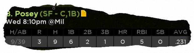 #17Why would anyone "hate" having Posey? He is head and shoulders above all other catchers in MLB and frankly it's not even close. Find another catcher that you can pencil in for 15-20 HR, 100 RBI and .300 BA with a lot of at-bats because Posey plays first base when he is "off".Comment -