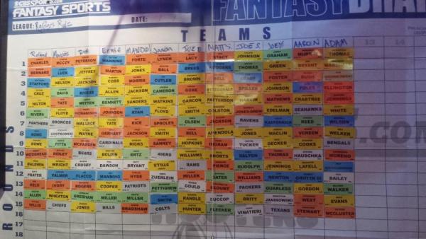 I just had my fantasy draft last night at Hooters. It was a 12 team, snake style draft. Our league scoring is a little different than the traditional Yahoo format, where we have 20 yards/1 point for passing yards, 6 points for passing tds, -1 for ints, and 7 points/rushing td. Everything else is the same, so no PPR or any of that. We do get points for return yards for the player and 6 points/return TD for that person's defense/special teams. Here is the entire draft and how it went down. As you can see, some people know what they're doing and some just read from lists. Who do you think has the best team?