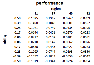 Basically, I have a factor in a model I'm building called "performance" that another factor "ability" predicts well. However, the factor is stronger when I group or cluster the information based on a "region" variable. There are dozens of regions. The screenshot of the data below shows what I mean.