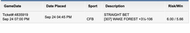 | STRAIGHT BET | Sep 24 | CFB [308] VIRGINIA -3½-105 | 50.00 SBR / 47.62 SBR | 4835881 |