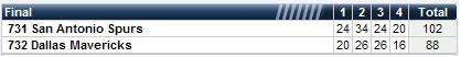 - predict the full game (including OT) box score (including which team is leading) & receive 100 points. 28-21 Spurs 4th/OT Final 103-110 Mavs
