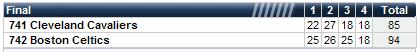 1st Q - Bos 24 - Clev 22 2nd Q -Bos 22 - Clev 23 3rd Q - Bos 26 - Clev 20 Final - Boston 97 - Clev 94