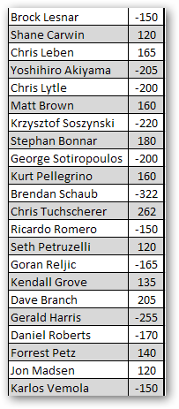<TABLE style="WIDTH: 560pt; BORDER-COLLAPSE: collapse" border=0 cellSpacing=0 cellPadding=0 width=744><COLGROUP><COL style="WIDTH: 95pt; mso-width-source: userset; mso-width-alt: 4644" width=127><COL style="WIDTH: 74pt; mso-width-source: userset; mso-width-alt: 3584" width=98><COL style="WIDTH: 41pt; mso-width-source: userset; mso-width-alt: 1974" width=54><COL style="WIDTH: 63pt; mso-width-source: userset; mso-width-alt: 3072" width=84><COL style="WIDTH: 21pt; mso-width-source: userset; mso-width-alt: 1024" width=28><COL style="WIDTH: 88pt; mso-width-source: userset; mso-width-alt: 4278" width=117><COL style="WIDTH: 74pt; mso-width-source: userset; mso-width-alt: 3584" width=98><COL style="WIDTH: 41pt; mso-width-source: userset; mso-width-alt: 1974" width=54><COL style="WIDTH: 63pt; mso-width-source: userset; mso-width-alt: 3072" width=84><TBODY><TR style="HEIGHT: 15pt" height=20><TD style="BORDER-BOTTOM: #ece9d8; BORDER-LEFT: #ece9d8; BACKGROUND-COLOR: transparent; WIDTH: 95pt; HEIGHT: 15pt; BORDER-TOP: #ece9d8; BORDER-RIGHT: #ece9d8" class=xl63 height=20 width=127>Name</TD><TD style="BORDER-BOTTOM: #ece9d8; BORDER-LEFT: #ece9d8; BACKGROUND-COLOR: transparent; WIDTH: 74pt; BORDER-TOP: #ece9d8; BORDER-RIGHT: #ece9d8" class=xl63 width=98>Height</TD><TD style="BORDER-BOTTOM: #ece9d8; BORDER-LEFT: #ece9d8; BACKGROUND-COLOR: transparent; WIDTH: 41pt; BORDER-TOP: #ece9d8; BORDER-RIGHT: #ece9d8" class=xl63 width=54>Weight</TD><TD style="BORDER-BOTTOM: #ece9d8; BORDER-LEFT: #ece9d8; BACKGROUND-COLOR: transparent; WIDTH: 63pt; BORDER-TOP: #ece9d8; BORDER-RIGHT: #ece9d8" class=xl67 width=84>Record</TD><TD style="BORDER-BOTTOM: #ece9d8; BORDER-LEFT: #ece9d8; BACKGROUND-COLOR: transparent; WIDTH: 21pt; BORDER-TOP: #ece9d8; BORDER-RIGHT: #ece9d8" class=xl63 width=28></TD><TD style="BORDER-BOTTOM: #ece9d8; BORDER-LEFT: #ece9d8; BACKGROUND-COLOR: transparent; WIDTH: 88pt; BORDER-TOP: #ece9d8; BORDER-RIGHT: #ece9d8" class=xl63 width=117>Name</TD><TD style="BORDER-BOTTOM: #ece9d8; BORDER-LEFT: #ece9d8; BACKGROUND-COLOR: transparent; WIDTH: 74pt; BORDER-TOP: #ece9d8; BORDER-RIGHT: #ece9d8" class=xl63 width=98>Height</TD><TD style="BORDER-BOTTOM: #ece9d8; BORDER-LEFT: #ece9d8; BACKGROUND-COLOR: transparent; WIDTH: 41pt; BORDER-TOP: #ece9d8; BORDER-RIGHT: #ece9d8" class=xl63 width=54>Weight</TD><TD style="BORDER-BOTTOM: #ece9d8; BORDER-LEFT: #ece9d8; BACKGROUND-COLOR: transparent; WIDTH: 63pt; BORDER-TOP: #ece9d8; BORDER-RIGHT: #ece9d8" class=xl67 width=84>Record</TD></TR><TR style="HEIGHT: 15pt" height=20><TD style="BORDER-BOTTOM: #ece9d8; BORDER-LEFT: #ece9d8; BACKGROUND-COLOR: transparent; WIDTH: 95pt; HEIGHT: 15pt; BORDER-TOP: #ece9d8; BORDER-RIGHT: #ece9d8" class=xl64 height=20 width=127>Brock Lesnar</TD><TD style="BORDER-BOTTOM: #ece9d8; BORDER-LEFT: #ece9d8; BACKGROUND-COLOR: transparent; WIDTH: 74pt; BORDER-TOP: #ece9d8; BORDER-RIGHT: #ece9d8" class=xl65 width=98>6' 3" (191 cm)</TD><TD style="BORDER-BOTTOM: #ece9d8; BORDER-LEFT: #ece9d8; BACKGROUND-COLOR: transparent; WIDTH: 41pt; BORDER-TOP: #ece9d8; BORDER-RIGHT: #ece9d8" class=xl65 width=54>265</TD><TD style="BORDER-BOTTOM: #ece9d8; BORDER-LEFT: #ece9d8; BACKGROUND-COLOR: transparent; WIDTH: 63pt; BORDER-TOP: #ece9d8; BORDER-RIGHT: #ece9d8" class=xl68 width=84>4-1-0</TD><TD style="BORDER-BOTTOM: #ece9d8; BORDER-LEFT: #ece9d8; PADDING-BOTTOM: 0px; BACKGROUND-COLOR: transparent; WIDTH: 21pt; BORDER-TOP: #ece9d8; BORDER-RIGHT: #ece9d8; PADDING-TOP: 0px" class=xl70 width=28>Vs.</TD><TD style="BORDER-BOTTOM: #ece9d8; BORDER-LEFT: #ece9d8; BACKGROUND-COLOR: transparent; WIDTH: 88pt; BORDER-TOP: #ece9d8; BORDER-RIGHT: #ece9d8" class=xl64 width=117>Shane Carwin</TD><TD style="BORDER-BOTTOM: #ece9d8; BORDER-LEFT: #ece9d8; BACKGROUND-COLOR: transparent; WIDTH: 74pt; BORDER-TOP: #ece9d8; BORDER-RIGHT: #ece9d8" class=xl65 width=98>6' 2" (188 cm)</TD><TD style="BORDER-BOTTOM: #ece9d8; BORDER-LEFT: #ece9d8; BACKGROUND-COLOR: transparent; WIDTH: 41pt; BORDER-TOP: #ece9d8; BORDER-RIGHT: #ece9d8" class=xl65 width=54>265</TD><TD style="BORDER-BOTTOM: #ece9d8; BORDER-LEFT: #ece9d8; BACKGROUND-COLOR: transparent; WIDTH: 63pt; BORDER-TOP: #ece9d8; BORDER-RIGHT: #ece9d8" class=xl68 width=84>12-0-0</TD></TR><TR style="HEIGHT: 15pt" height=20><TD style="BORDER-BOTTOM: #ece9d8; BORDER-LEFT: #ece9d8; BACKGROUND-COLOR: transparent; WIDTH: 95pt; HEIGHT: 15pt; BORDER-TOP: #ece9d8; BORDER-RIGHT: #ece9d8" class=xl64 height=20 width=127>Yoshihiro Akiyama</TD><TD style="BORDER-BOTTOM: #ece9d8; BORDER-LEFT: #ece9d8; BACKGROUND-COLOR: transparent; WIDTH: 74pt; BORDER-TOP: #ece9d8; BORDER-RIGHT: #ece9d8" class=xl65 width=98>5' 10" (178 cm)</TD><TD style="BORDER-BOTTOM: #ece9d8; BORDER-LEFT: #ece9d8; BACKGROUND-COLOR: transparent; WIDTH: 41pt; BORDER-TOP: #ece9d8; BORDER-RIGHT: #ece9d8" class=xl65 width=54>185</TD><TD style="BORDER-BOTTOM: #ece9d8; BORDER-LEFT: #ece9d8; BACKGROUND-COLOR: transparent; WIDTH: 63pt; BORDER-TOP: #ece9d8; BORDER-RIGHT: #ece9d8" class=xl68 width=84>13-1-0, 2 NC</TD><TD style="BORDER-BOTTOM: #ece9d8; BORDER-LEFT: #ece9d8; PADDING-BOTTOM: 0px; BACKGROUND-COLOR: transparent; WIDTH: 21pt; BORDER-TOP: #ece9d8; BORDER-RIGHT: #ece9d8; PADDING-TOP: 0px" class=xl70 width=28>Vs.</TD><TD style="BORDER-BOTTOM: #ece9d8; BORDER-LEFT: #ece9d8; BACKGROUND-COLOR: transparent; WIDTH: 88pt; BORDER-TOP: #ece9d8; BORDER-RIGHT: #ece9d8" class=xl64 width=117>Chris Leben</TD><TD style="BORDER-BOTTOM: #ece9d8; BORDER-LEFT: #ece9d8; BACKGROUND-COLOR: transparent; WIDTH: 74pt; BORDER-TOP: #ece9d8; BORDER-RIGHT: #ece9d8" class=xl65 width=98>5' 11" (180 cm)</TD><TD style="BORDER-BOTTOM: #ece9d8; BORDER-LEFT: #ece9d8; BACKGROUND-COLOR: transparent; WIDTH: 41pt; BORDER-TOP: #ece9d8; BORDER-RIGHT: #ece9d8" class=xl65 width=54>185</TD><TD style="BORDER-BOTTOM: #ece9d8; BORDER-LEFT: #ece9d8; BACKGROUND-COLOR: transparent; WIDTH: 63pt; BORDER-TOP: #ece9d8; BORDER-RIGHT: #ece9d8" class=xl68 width=84>20-6-0</TD></TR><TR style="HEIGHT: 15pt" height=20><TD style="BORDER-BOTTOM: #ece9d8; BORD