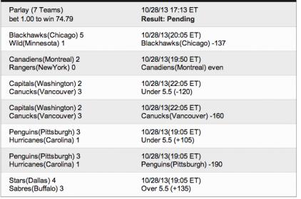 #4I had a similar experience today. Took Buffalo, Pit, and Chicago all in regulation (10 to win 104). Was certainly a nice win. Congrats on your win as well!Comment