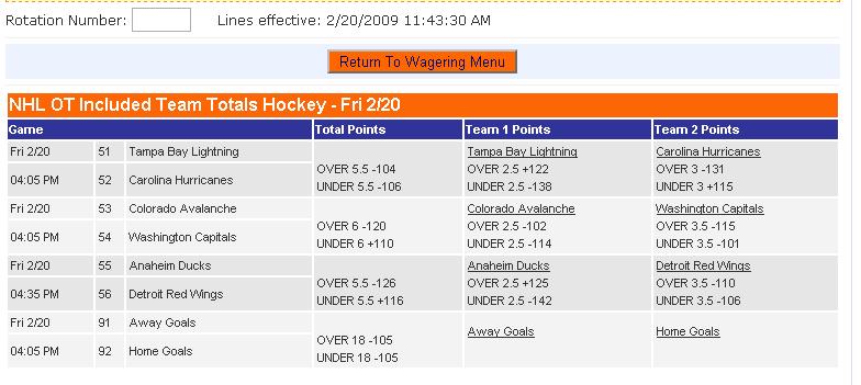 NHL OT Included Team Totals Hockey - Fri 2/20
