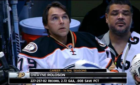 45 year old Dwayne Roloson comes out of retirement tonight to be the backup goaltender for the Anaheim Ducks after John Gibson was injured in warmups. Roloson works for the Ducks as a goaltending consultant. Jason LaBarbera is making his Anaheim Ducks debut as the starting net minder.